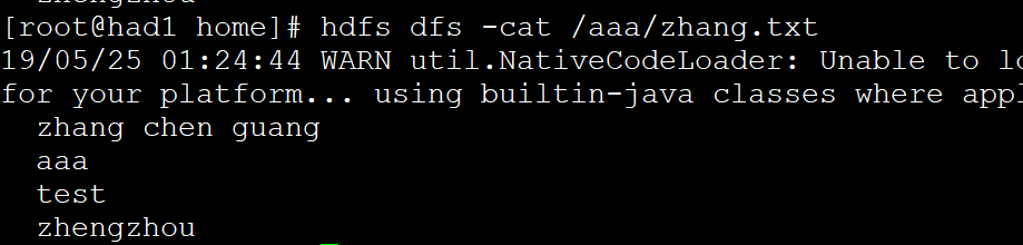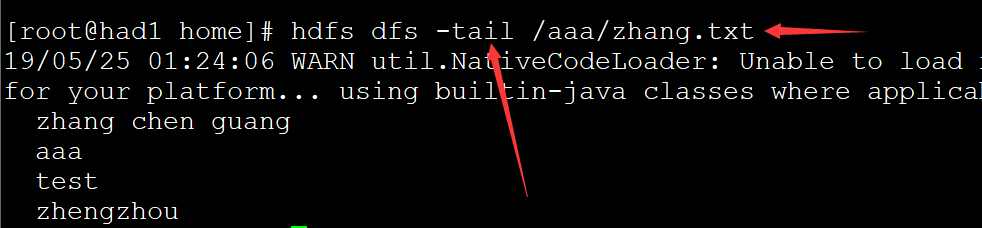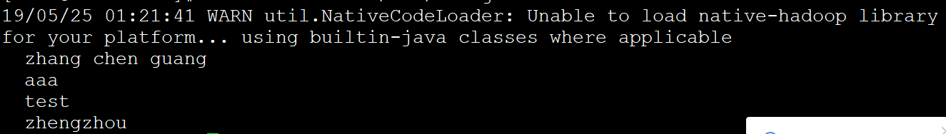 19/06/25 00:00:22 WARN util.NativeCodeLoader: Unable to load native-hadoop library for your platform... using builtin-java classes where applicable hello,zhangChenguang hello,HDFS hello,zhangChenguang hello,HDFS |