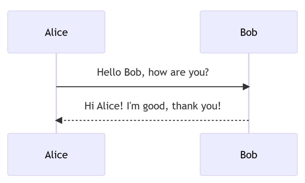 Bob-->>Alice: Hi Alice! I'm good, thank you!