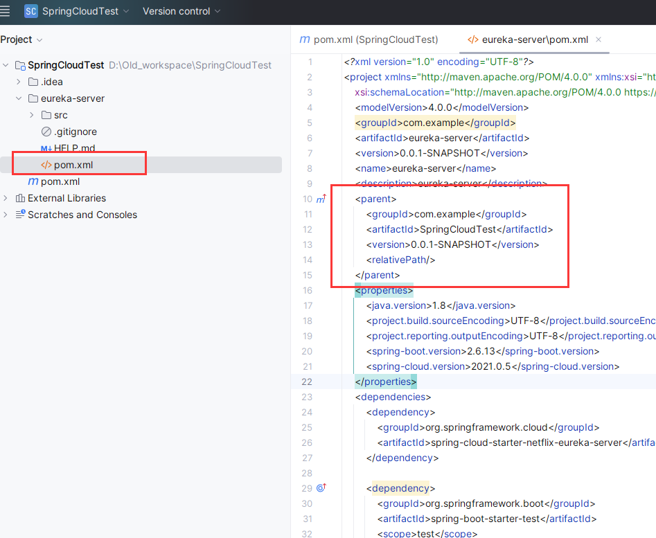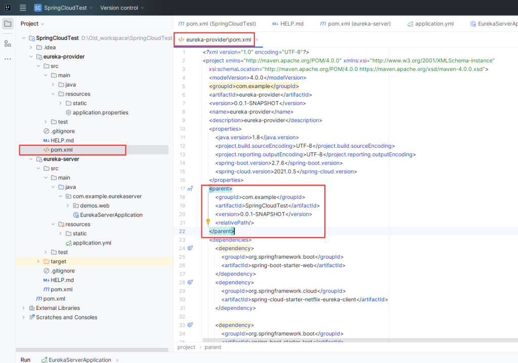 修改 eureka-server 模块的 pom.xml,将其中的 parent 标签内容,指向父工程。