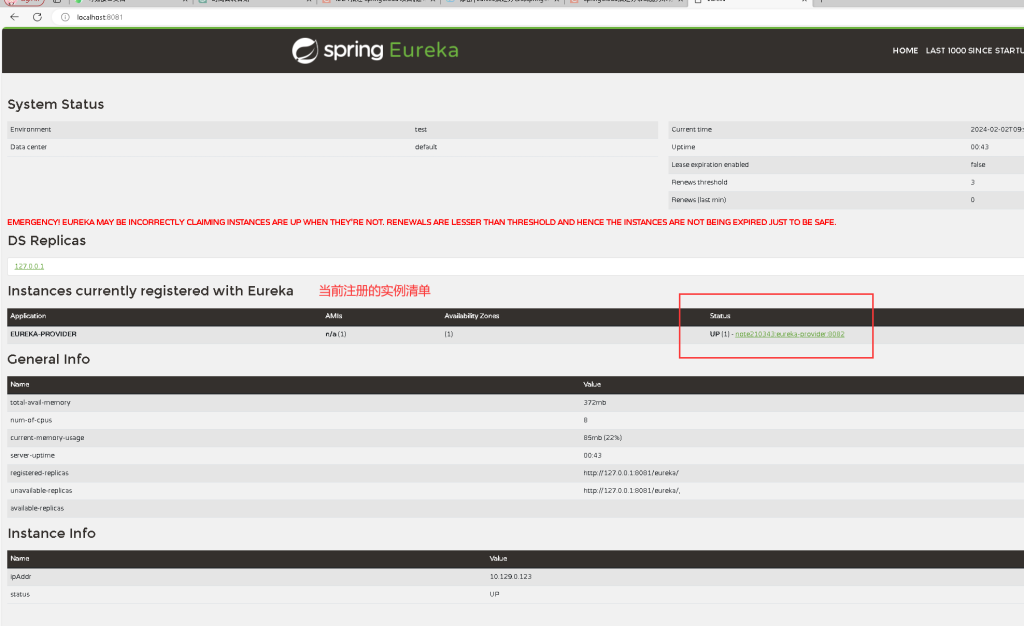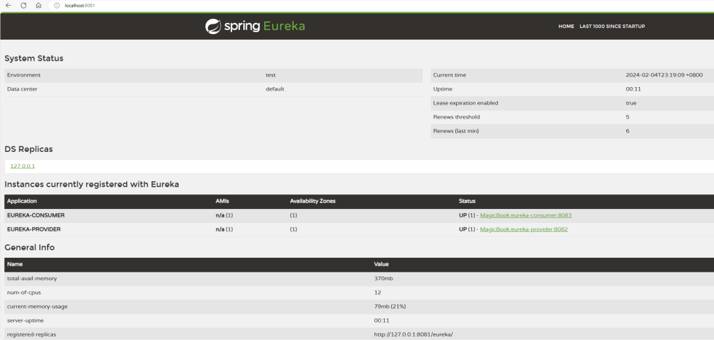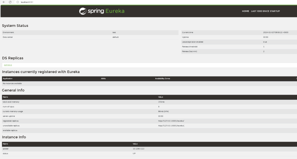 确认控制台正常加载,在控制台上能够看到服务实例的信息,表示Eureka注册中心已成功启动。