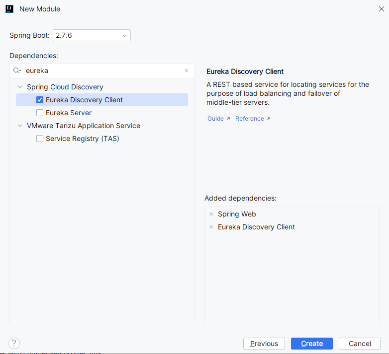 勾选 Eureka Discovery Client,用于注册到 eureka-server 服务注册中心。