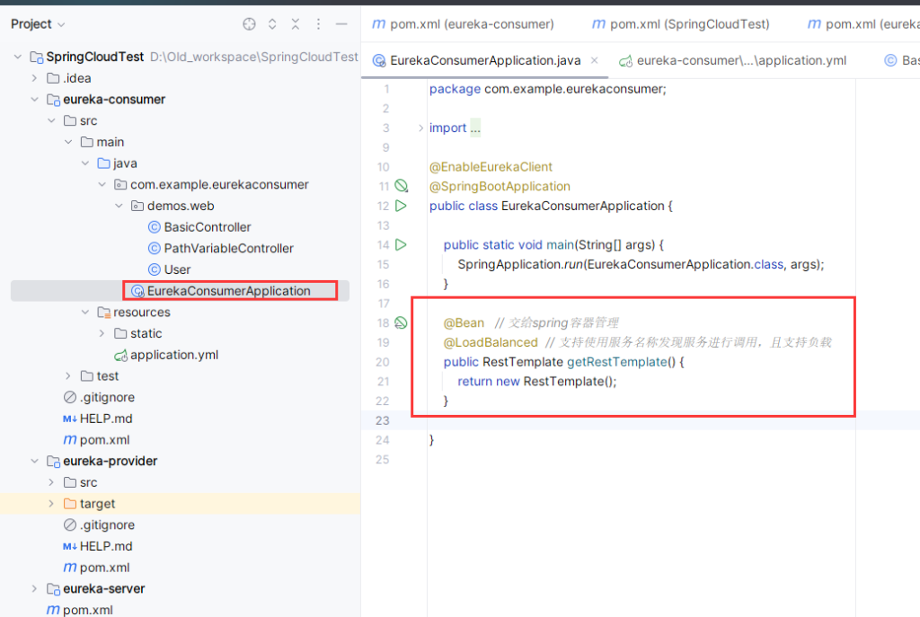 在消费者的配置类或者项目启动类中创建一个带有 @LoadBalanced 注解的 RestTemplate Bean,该注解启用了 Ribbon 的负载均衡功能: