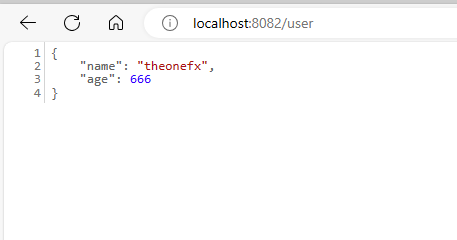 然后,我们来直接调用生产者 eureka-provier 的用户服务接口 /user。访问地址:localhost:8082/user,可以看到成功返回给我们一个 User 对象。