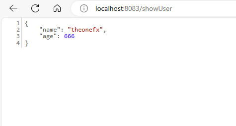 接着,我们来通过消费者 eureka-consumer 来调用生产者 eureka-provier 的用户服务接口,访问地址:localhost:8083/showUser,可以看到也是成功返回给我们一个 User 对象。这里的对象就是eureka-provier 的用户服务接口 /user 返回给我们的。