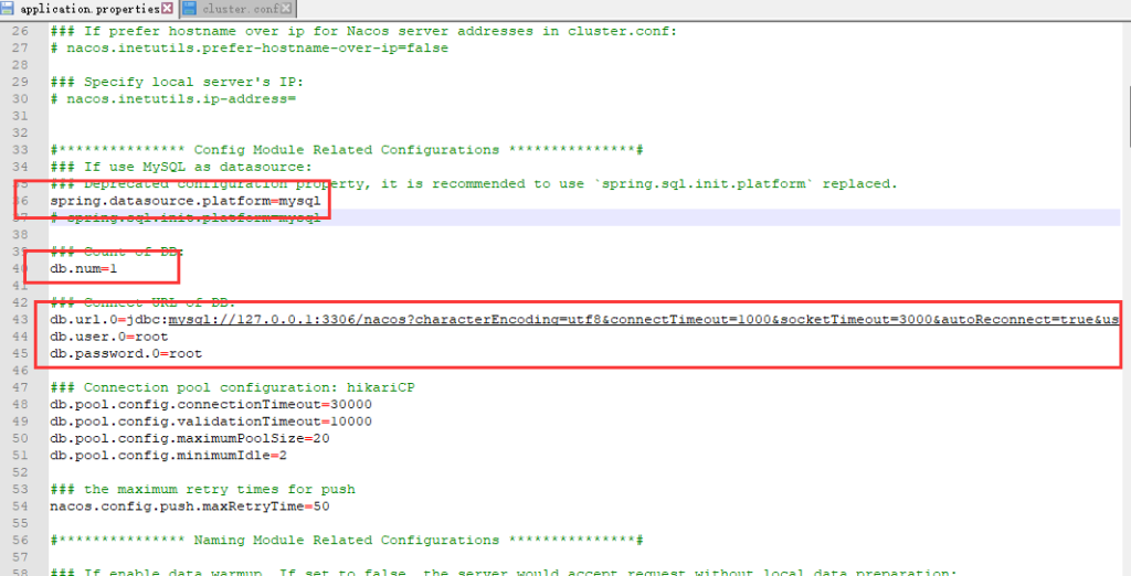 下面的 jdbc 连接信息,改为我们数据库的账号密码,连接的就是我们刚刚创建的 Nacos 数据库。