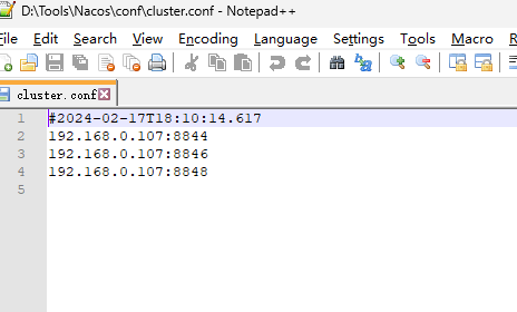 修改复制出来的 cluster.conf 文件,把三个 nacos 服务端地址都添加到里面: