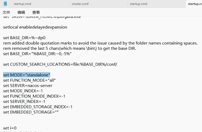 用写字板编辑 startup.cmd,将 set MODE= “cluster” 修改为: