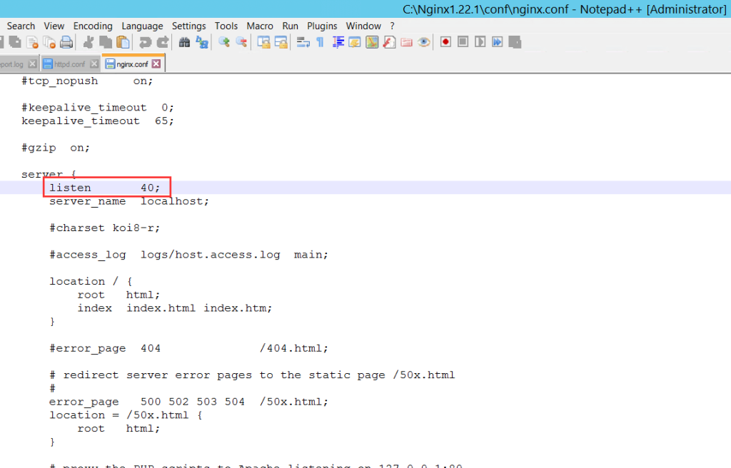 如果被占用了,我们可以修改 Nginx\conf\nginx.conf 文件里的监听端口号,来指定默认端口。