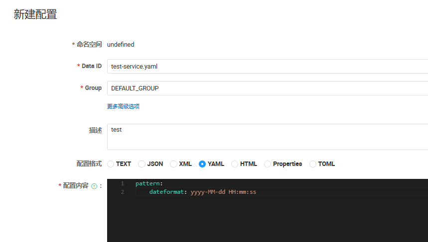 配置起名为:test-service.yaml,类型选为 YAML 类型,配置内容我们写一个时间格式: