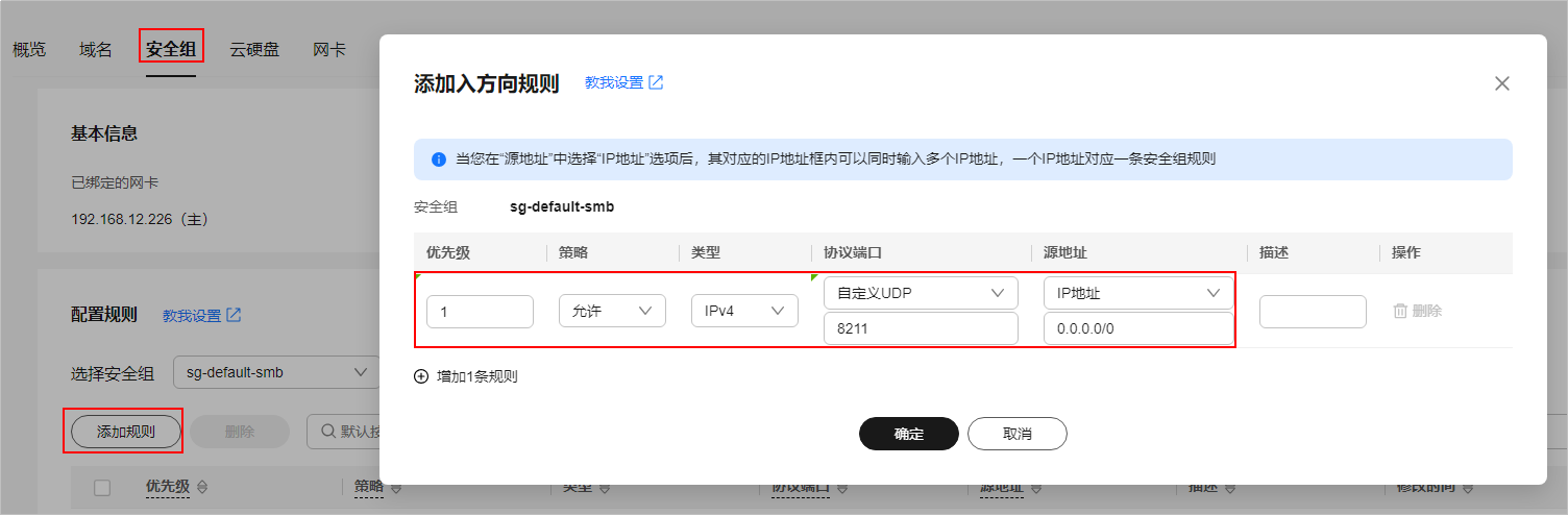 选择“安全组”页签,单击“添加规则”,放通连接幻兽帕鲁游戏所需的8211端口。