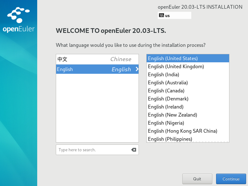 为虚拟机设置系统语言为English>English(United States),设置好后单击“Continue”继续。