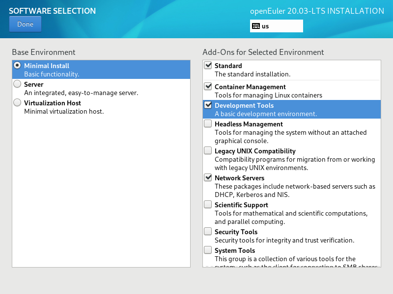 在Software Selection(软件选择)界面可自定义选择自己需要用的软件安装,此处我们选择了Minimal Install(最少安装)>Standard(标准)、Container Management(容器管理)、Development Tools(开发工具)、Network Servers(网络服务)安装。