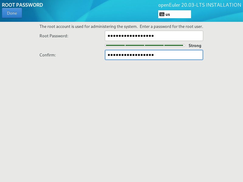 开始设置root密码,完成后单击“Done”。