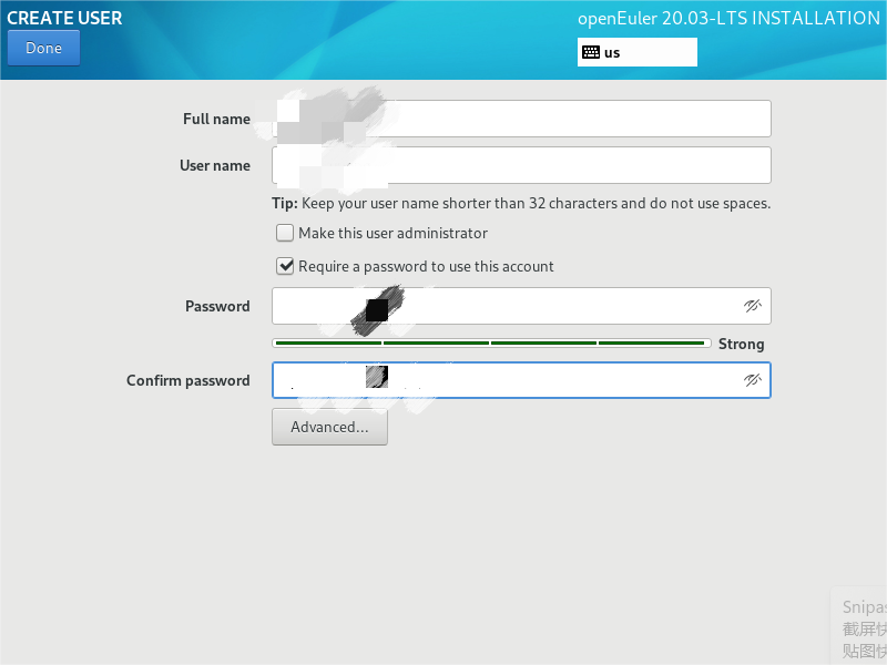 创建用户,设置用户名称和密码,完成后单击“Done”。