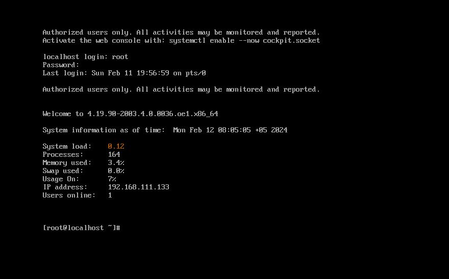 输入正确密码登录成功后,显示系统的一些配置信息。