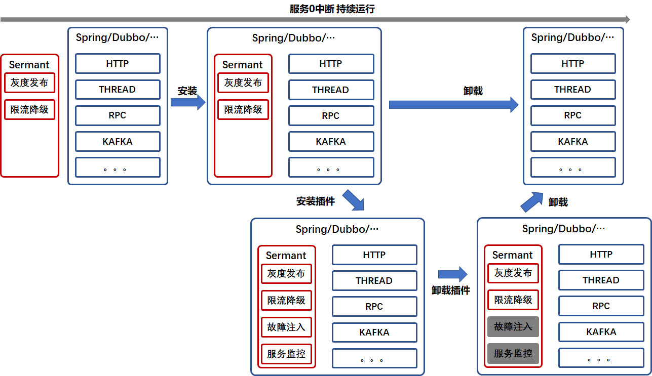 下图为Sermant的热插拔能力的示意图,在初始状态可以通过动态挂载Agent的能力安装字节码增强框架,然后可以通过动态挂载/卸载插件的能力在运行态增减所需服务治理能力,也可以直接将整个Agent进行卸载。