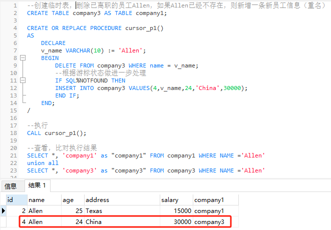 --创建临时表,删除已离职的员工Allen,如果Allen已经不存在,则新增一条新员工信息(重名)