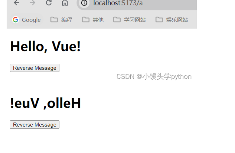 这样,当你打开这个 HTML 文件时,就会看到一个包含“Hello, Vue!”消息的标题和一个按钮。点击按钮后,消息会被反转。