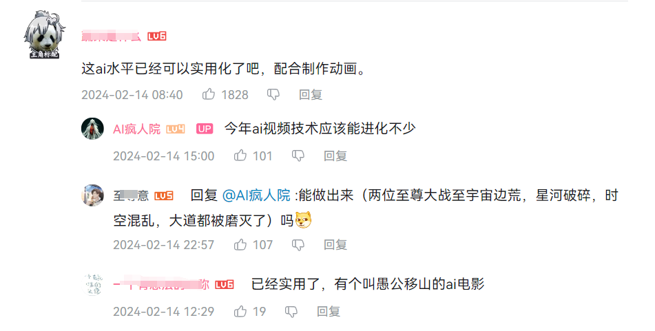 在应用上,以Sora为代表的AI视频生成正在帮助人们在提升效率的道路上加速前行。前段时间,UP主“AI疯人院”用AI制作了《西游记》短片,也引发了大众热议。短片作者表示,自己人工制作至少需要半年,而通过AI生成,用时一周就完成了。