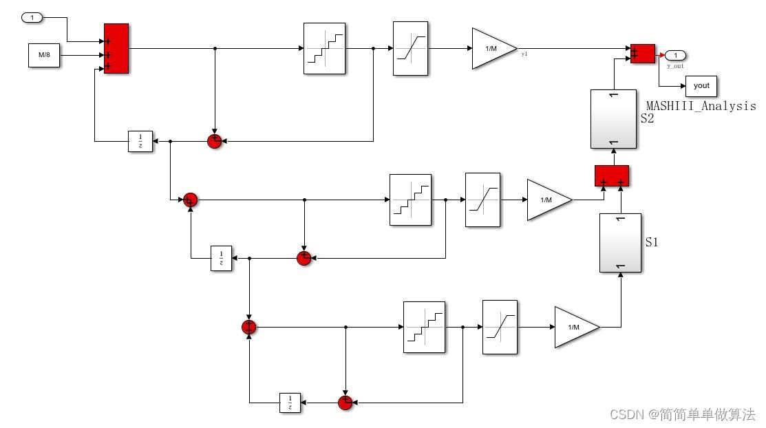 MASH III调制器是一种多级噪声整形和高阶单环结构,结合了多级Σ-Δ调制器的优点。MASH III调制器由多个级联的Σ-Δ调制器组成,每一级都有自己的量化器和反馈DAC。每一级的输出都被下一级用作输入的一部分,从而形成级联结构。最后一级的输出经过一个数字误差校正滤波器(DECF),以消除前面各级产生的量化噪声。MASH III调制器的数学模型相对复杂,涉及到多级Σ-Δ调制器的联合分析和数字滤波器的设计。