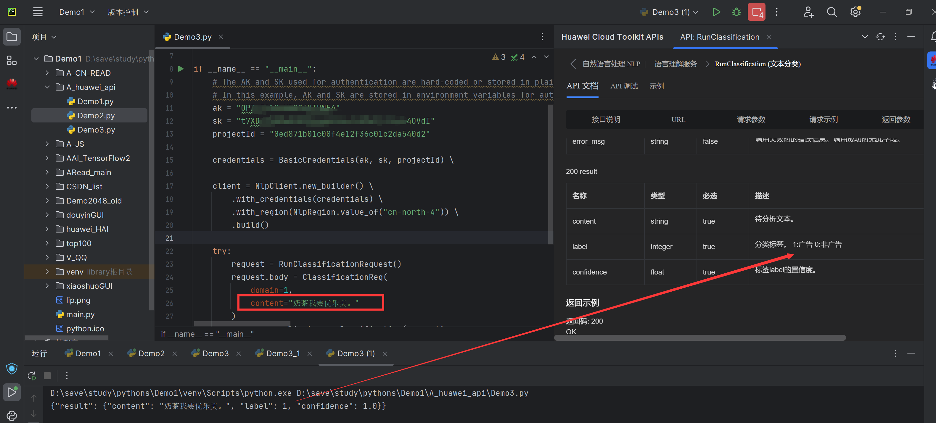 可以看到,这里的label返回的是1,所以肯定就是广告了,我们可以使用这个来判断你写的文章是否是广告,很迅速。