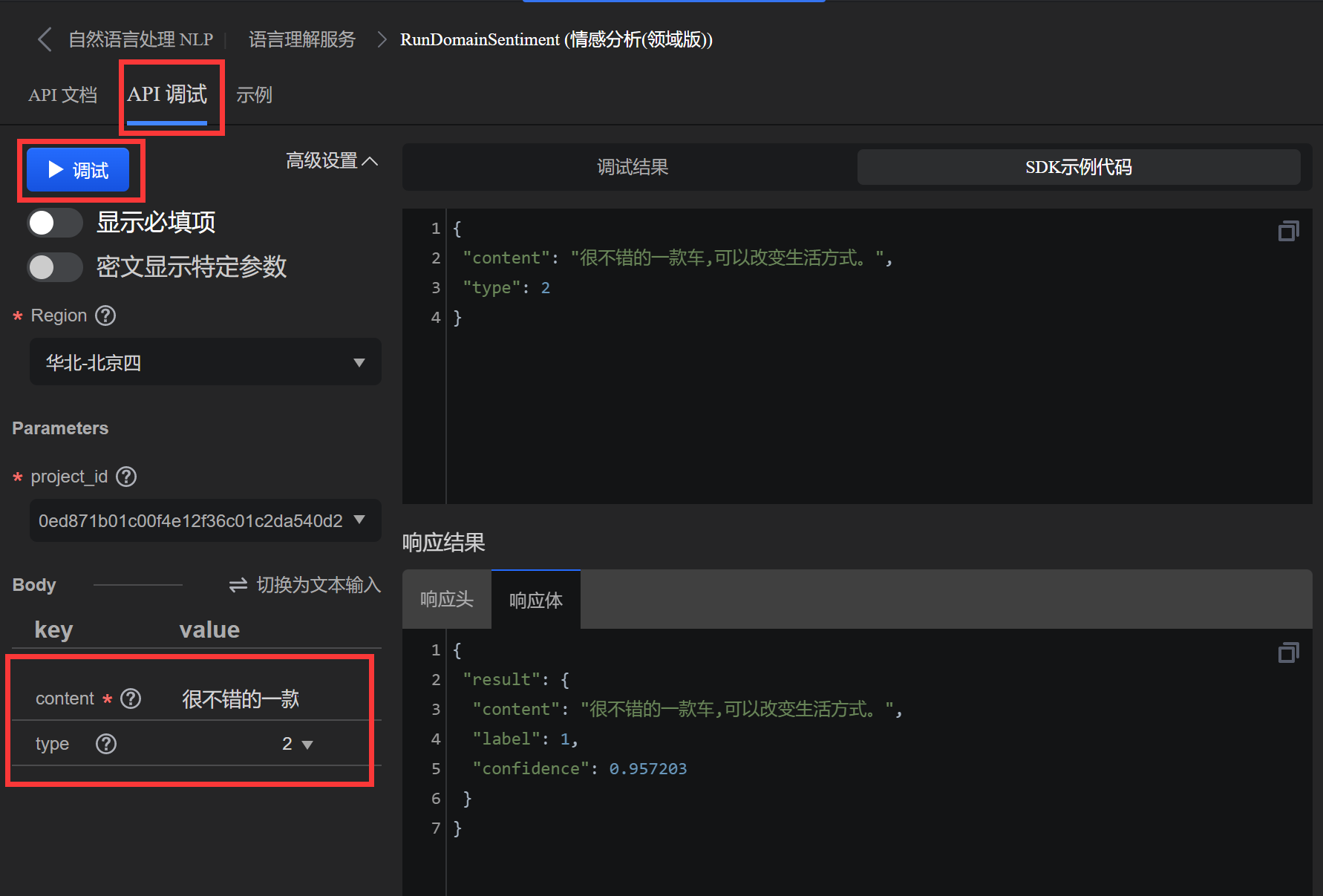 领域情感分析,针对未知领域,电商,汽车领域的用户评论进行情感分析。 在使用本API之前, 需要您完成服务申请。