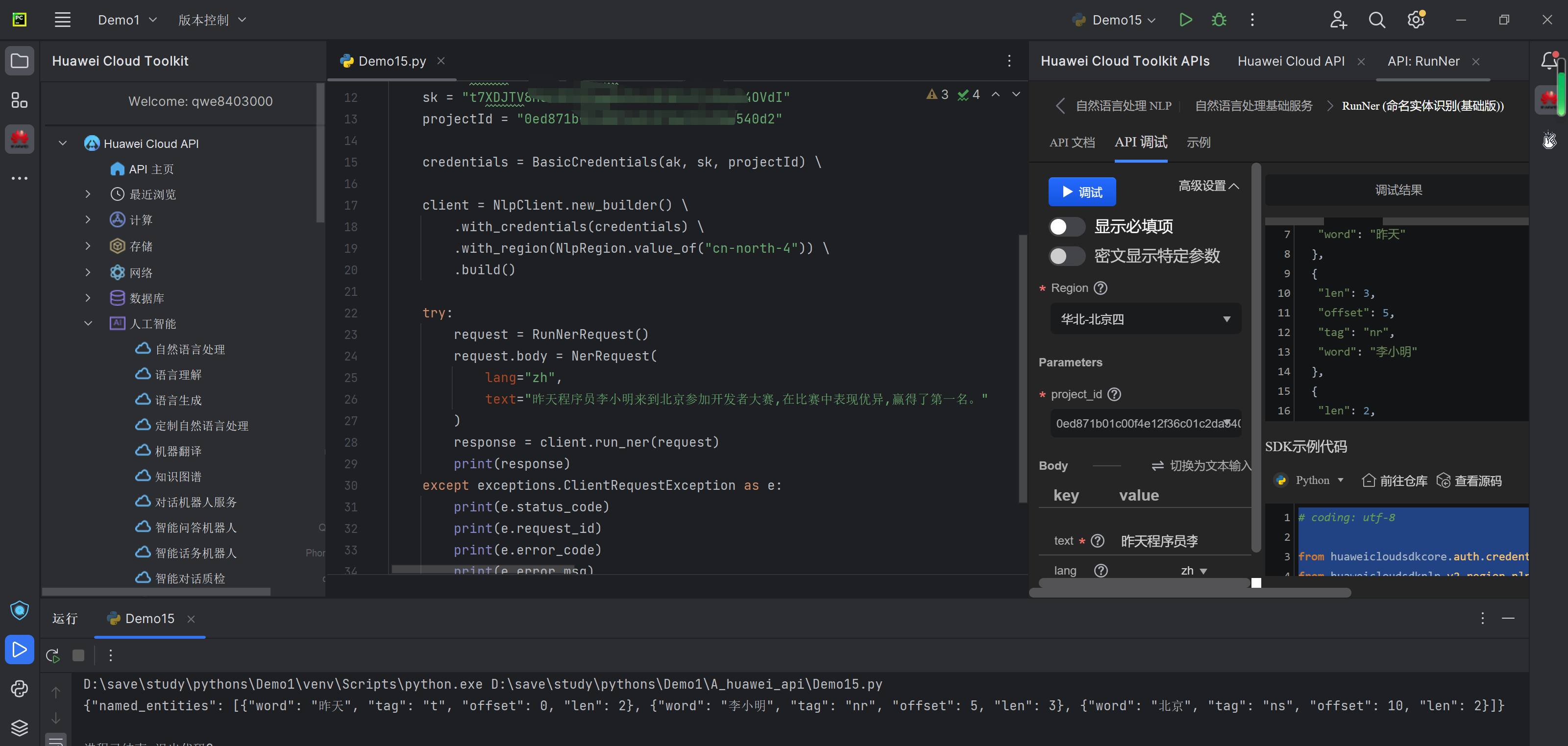 2、Huawei Cloud API:华为云API插件提供华为云服务全量API检索、调试、SDK代码自动补全、集成华为云CLI、示例代码等功能