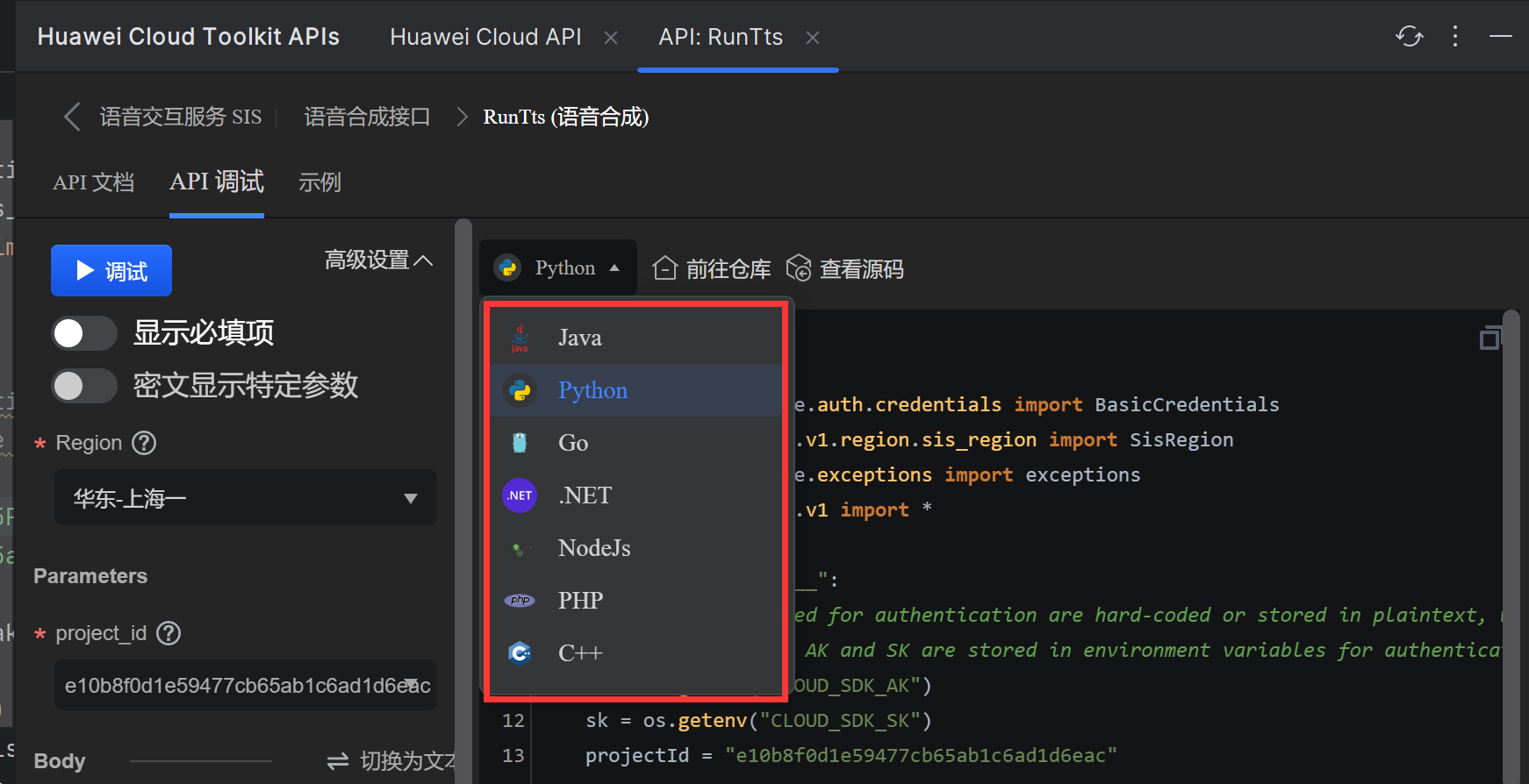 2、Huawei Cloud API:华为云API插件提供华为云服务全量API检索、调试、SDK代码自动补全、集成华为云CLI、示例代码等功能