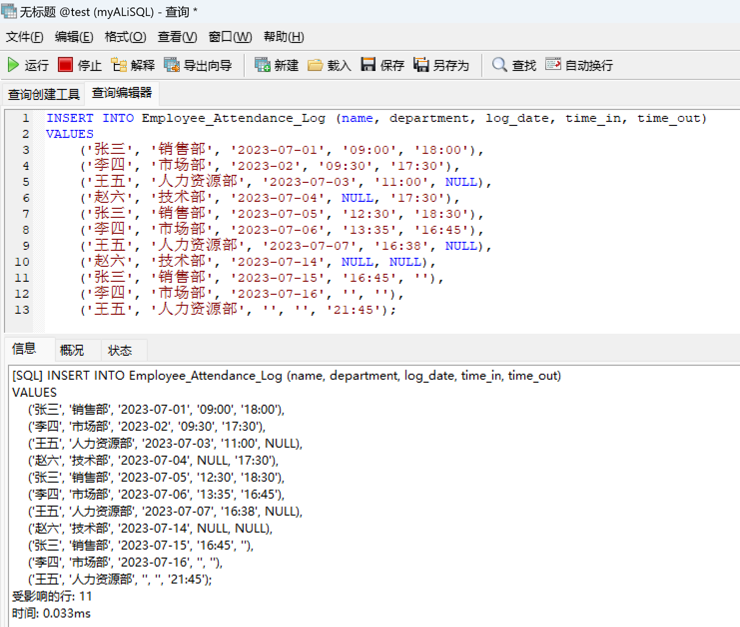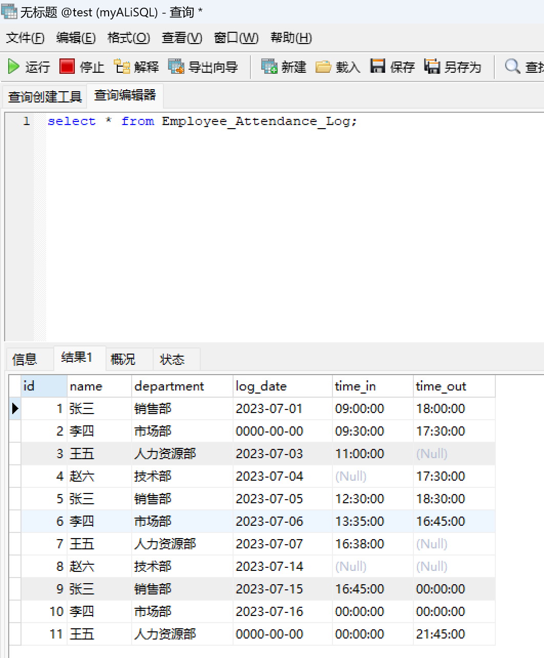 简单的员工打卡日志表的建表语句以及对应的测试数据。为了简单明了,我们将使用一个包含以下字段的表: