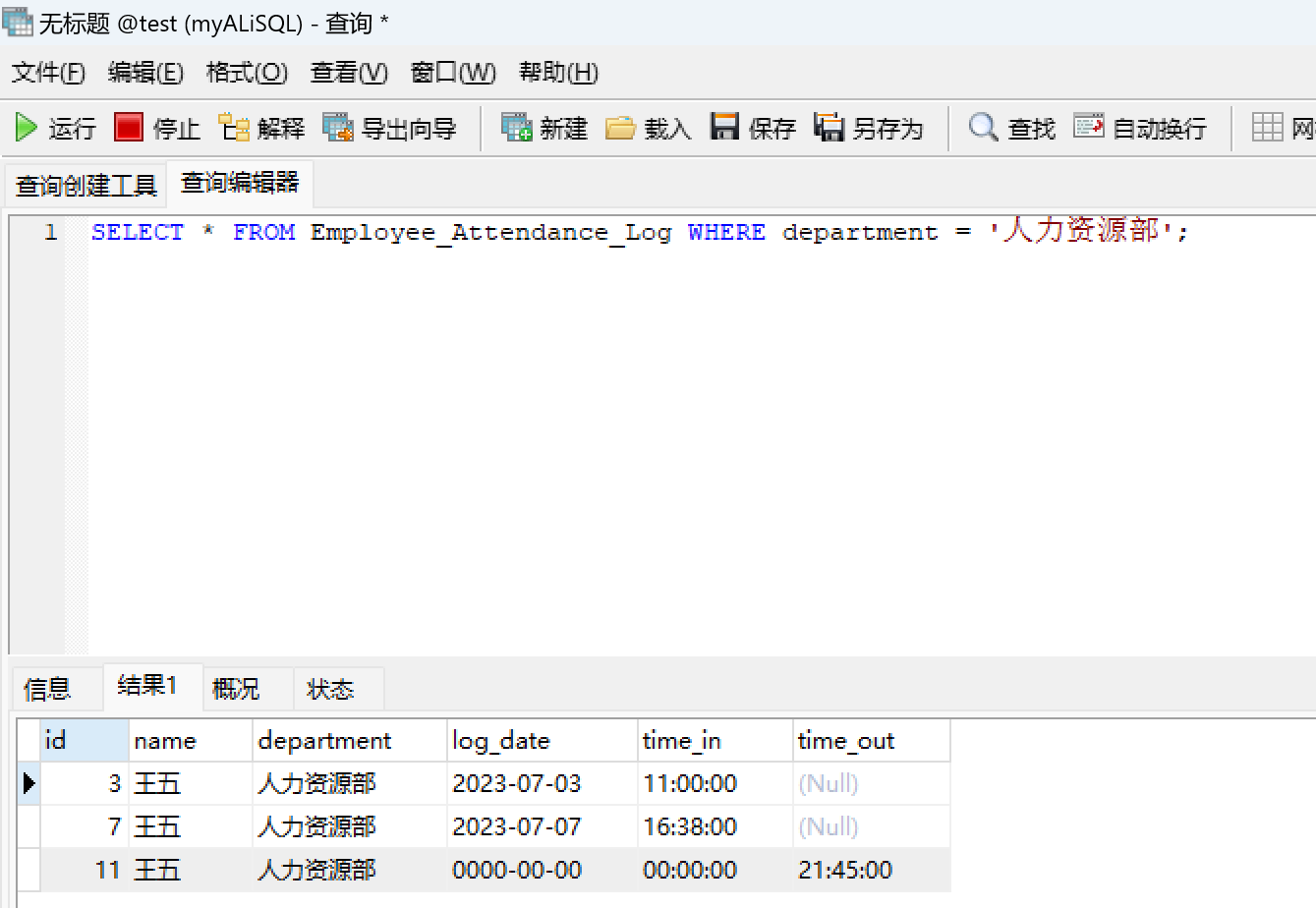 题目1:如何查询在 ‘人力资源部’ 的所有员工的出勤日志?