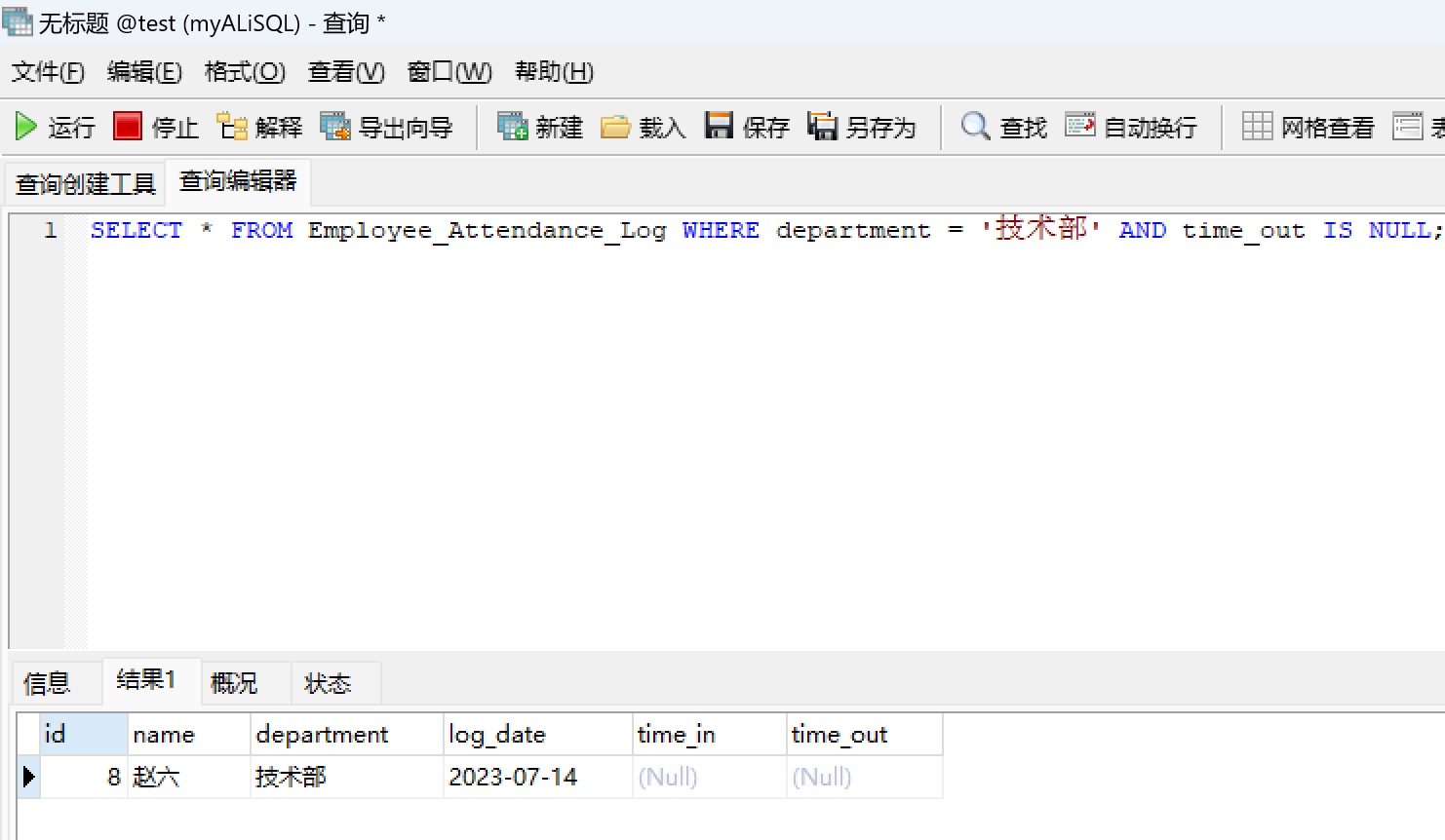 解析:根据查询条件,需要同时满足部门字段为 ‘技术部’ 和离开时间字段为 NULL,即可查询到在 ‘技术部’ 的员工的出勤日志中未填写离开时间的记录。