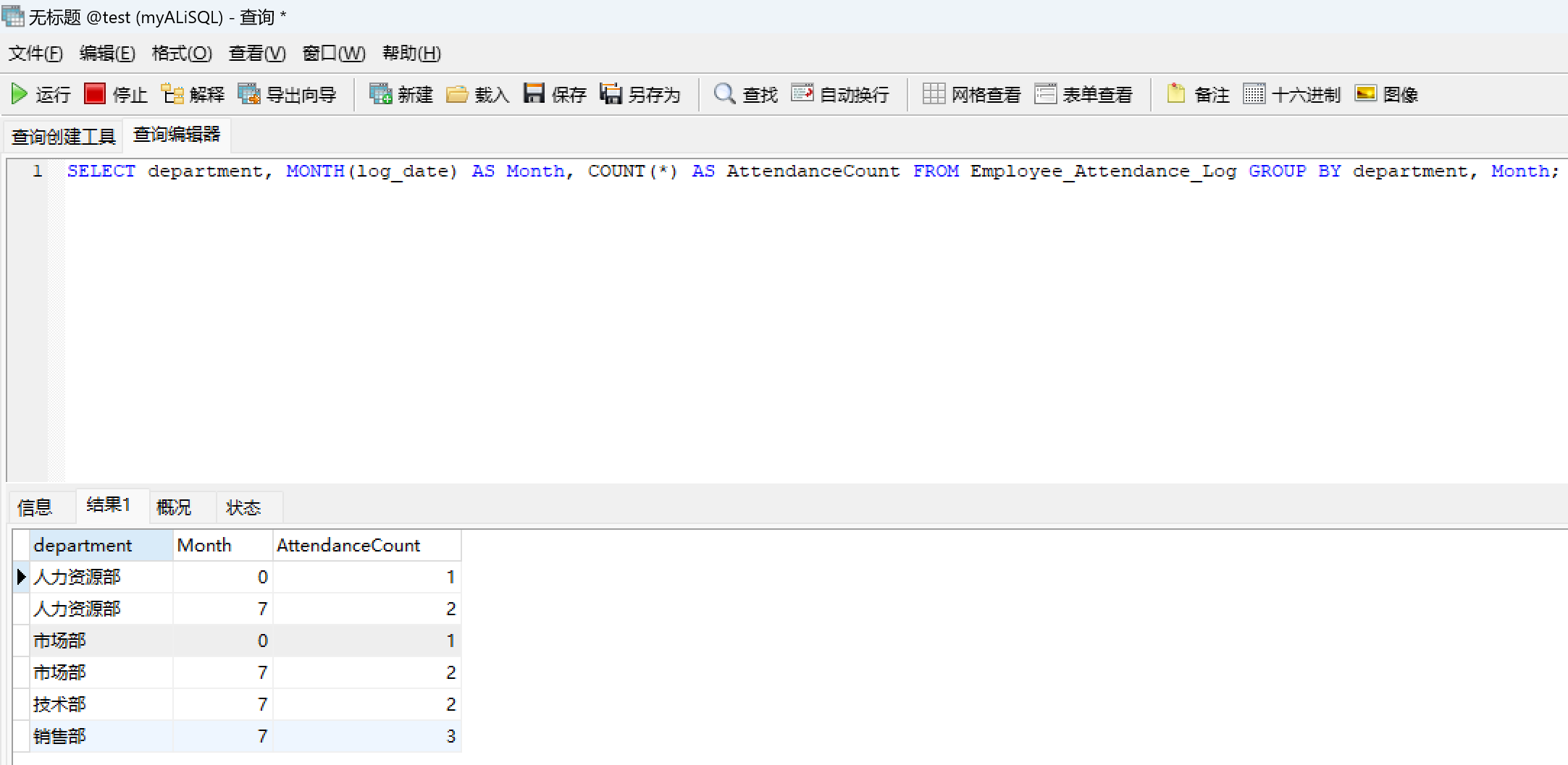 答案:可以使用以下查询语句来统计每个月份内各部门的员工出勤总次数:
