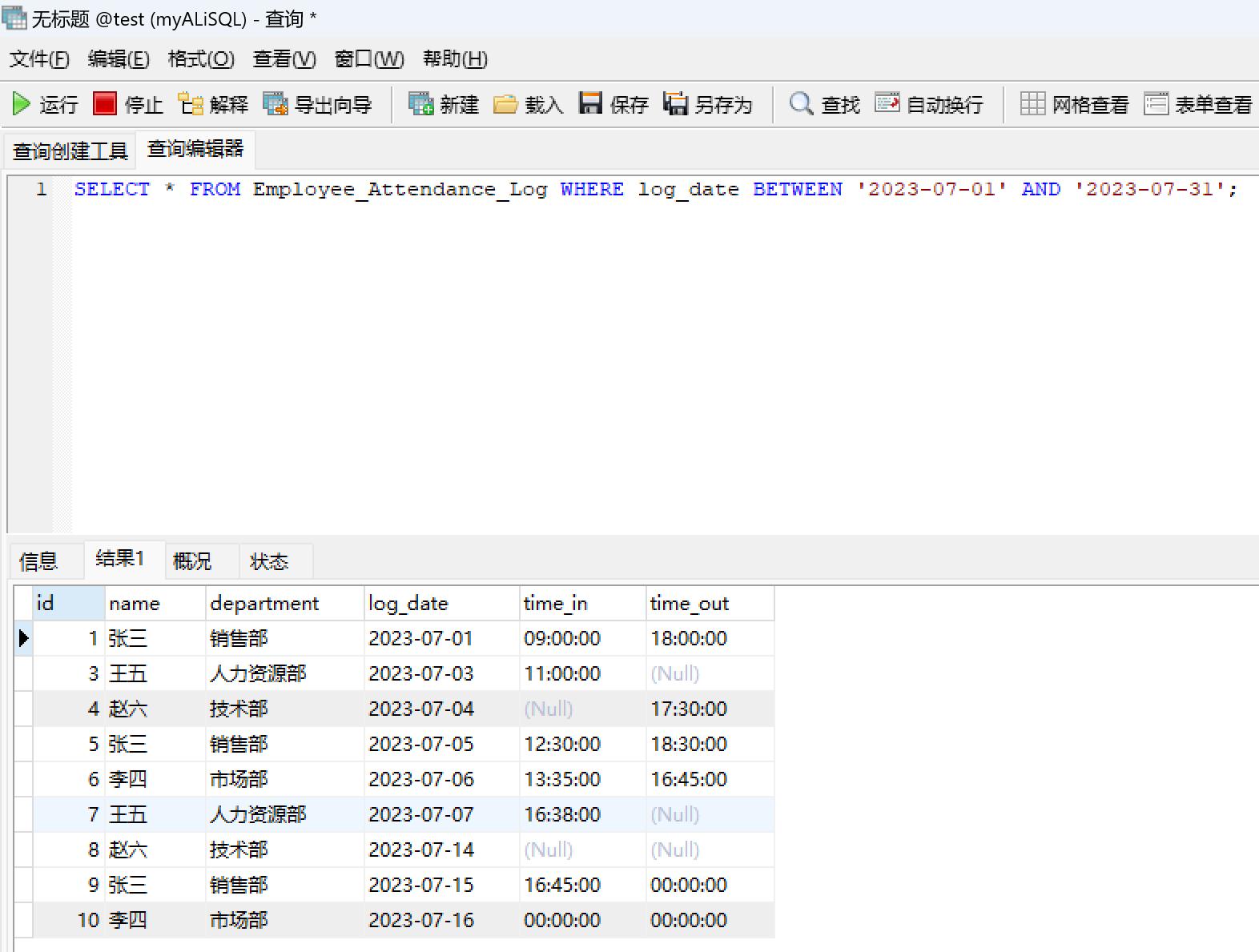 ('张三', '销售部', '2023-07-01', '09:00', '18:00'),
