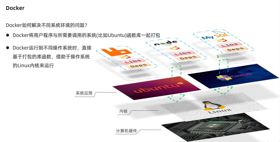 - Docker运行到不同操作系统时,直接基于打包的库函数,借助于操作系统的Linux内核来运行。