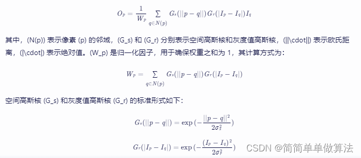 双边滤波的输出像素值是由输入图像中对应像素及其邻域像素的加权平均得到的。每个像素的权重由两个高斯核的乘积决定:一个是空间高斯核,另一个是灰度值高斯核(或称为范围高斯核)。设输入图像为 (I),输出图像为 (O),对于任意像素 (p),其坐标为 ((x, y)),双边滤波后的值 (O_p) 可表示为: