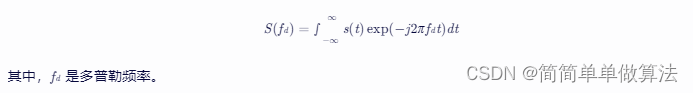 多普勒变换是一种将时域信号转换为多普勒频域的方法。对于单频信号 s(t)=Aexp(j2πf0t),其多普勒变换为: