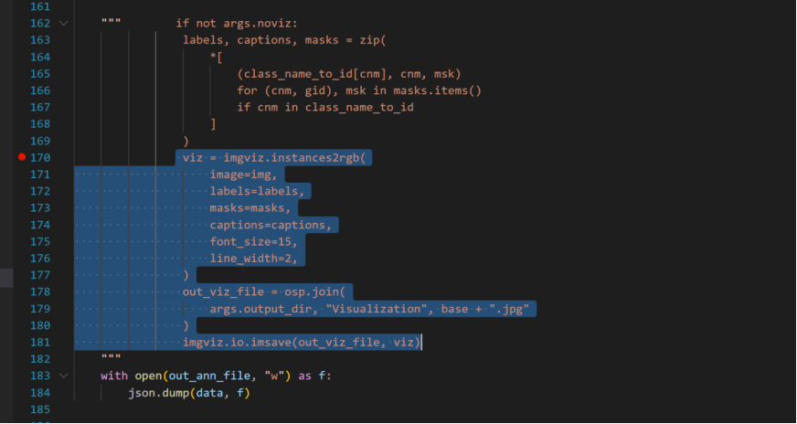 因为该数据集的标注格式是labelme,但是训练现需要的是coco格式,使用该项目中的labelme2coco.py进行格式转换,
