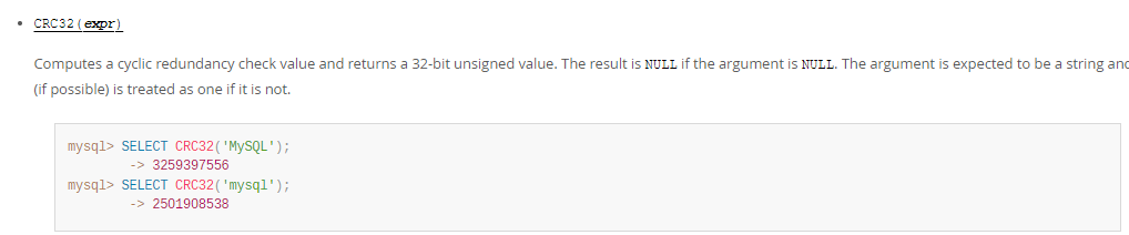 [Computes a cyclic redundancy check value and returns a 32-bit unsigned value. The result is NULL if the argument is NULL. The argument is expected to be a string and (if possible) is treated as one if it is not.]