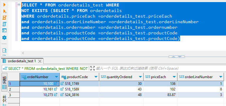 这样立刻就知道有2列 priceEach和orderLineNumber 数据和原表不一样了