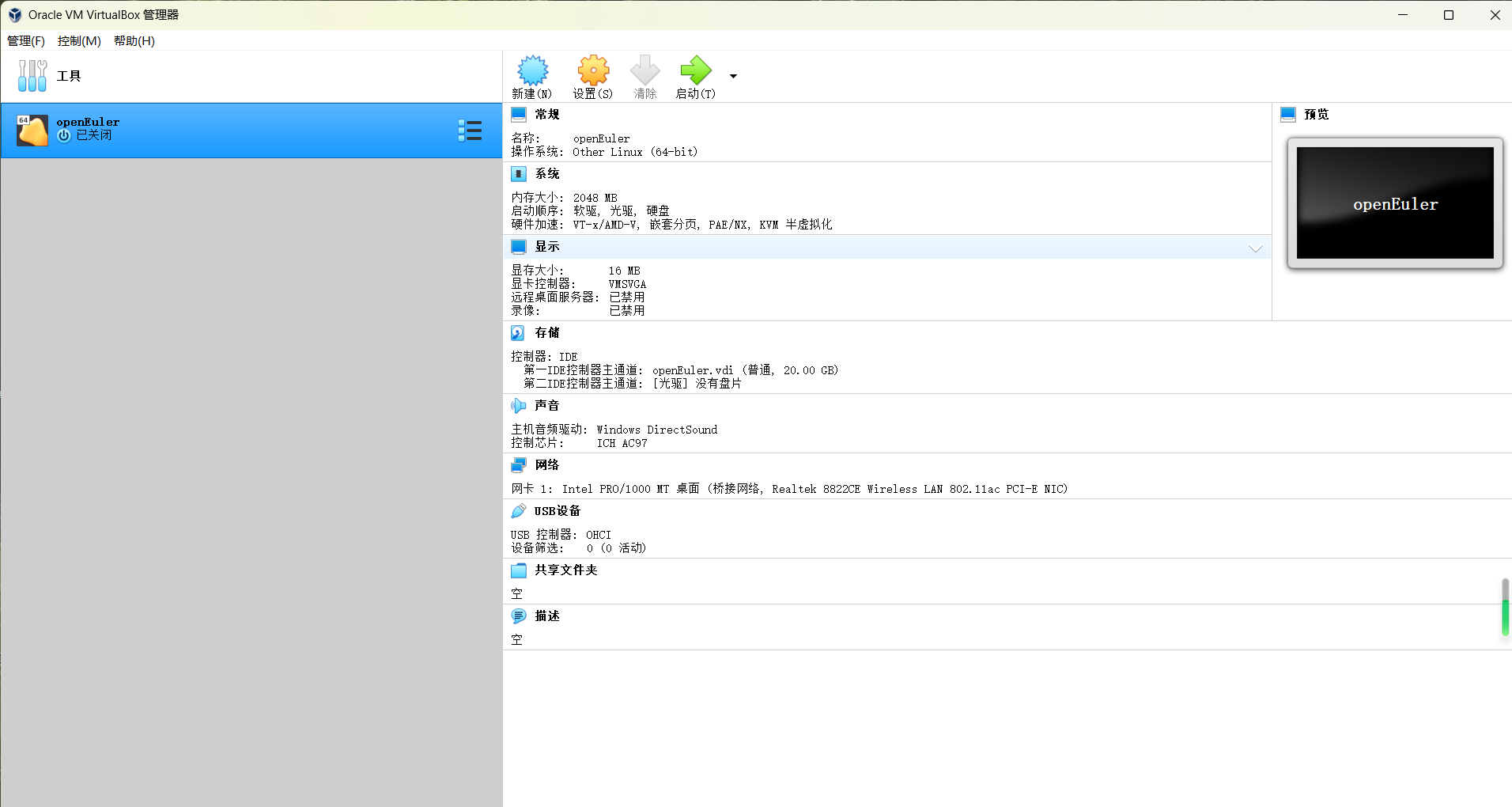 2. 打开VirtualBox后便可进行虚拟机的创建安装,此处可以看到我们已经创建了一台虚拟机。