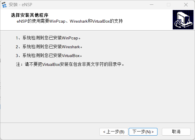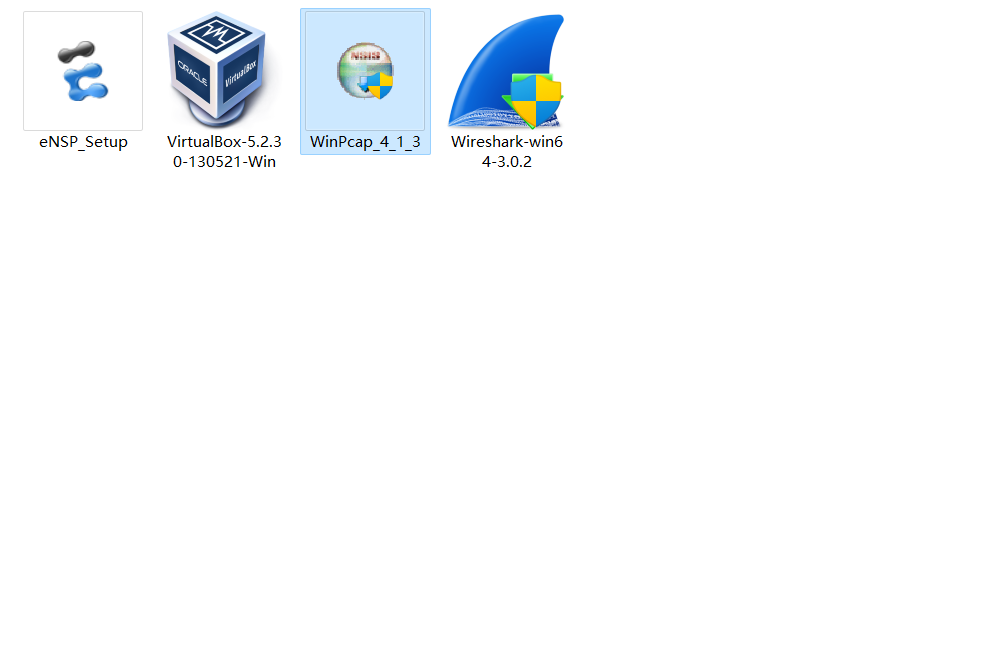 注意:安装eNSP之前请先安装WinPcap、Wireshark、VirtualBox。