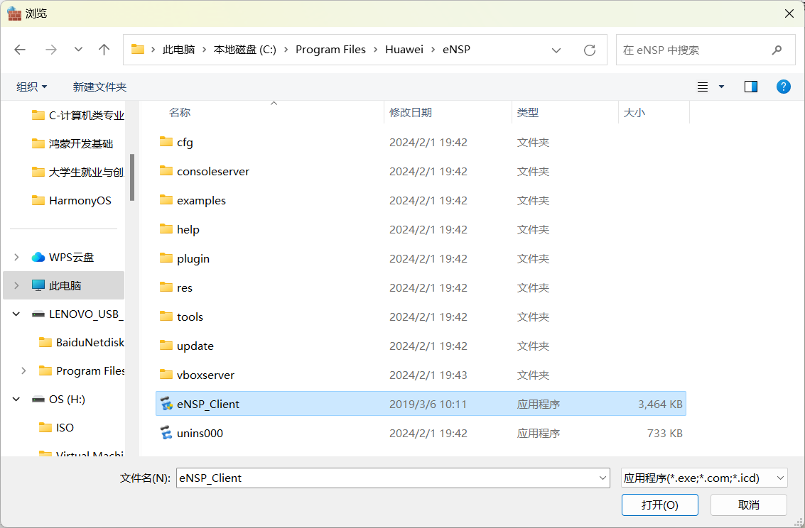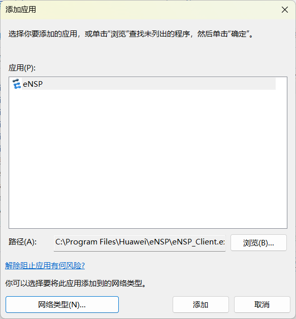 (3) 打开“添加应用”界面后,单击“浏览(B)...”,找到安装eNSP的目录选中“eNSP_Client.exe(/eNSP/eNSP_Client.exe)”文件后点击“打开(O)”。