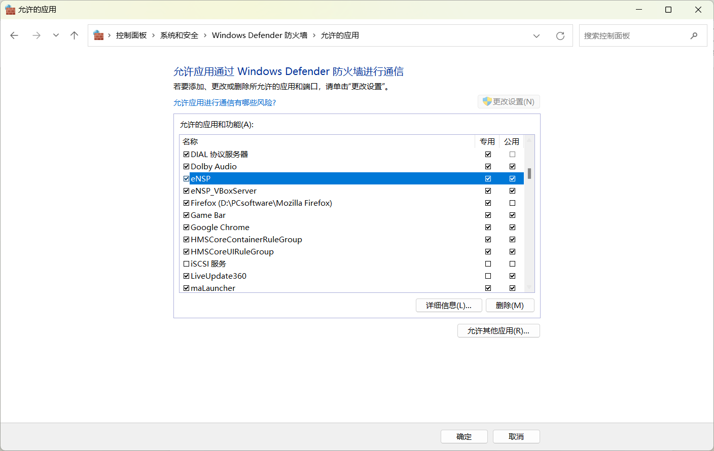 (8) 添加完成后,可以在“允许应用通过Windows Defender防火墙进行通信”页面看到eNSP和eNSP_VBoxServer项,