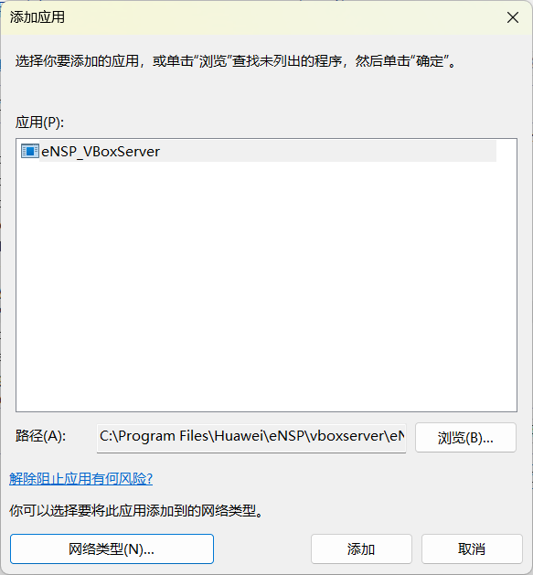 (7) 根据上述步骤重新添加“eNSP_VBoxServer.exe( /eNSP/vboxserver/eNSP_VBoxServer.exe)”文件并允许其使用公用和专用网络。