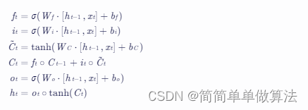 其中,ft、it和ot分别是遗忘门、输入门和输出门的输出,C~t是候选单元状态,Ct是单元状态,ht是隐藏状态,W和b是权重和偏置,σ是sigmoid激活函数,∘表示逐元素乘法。