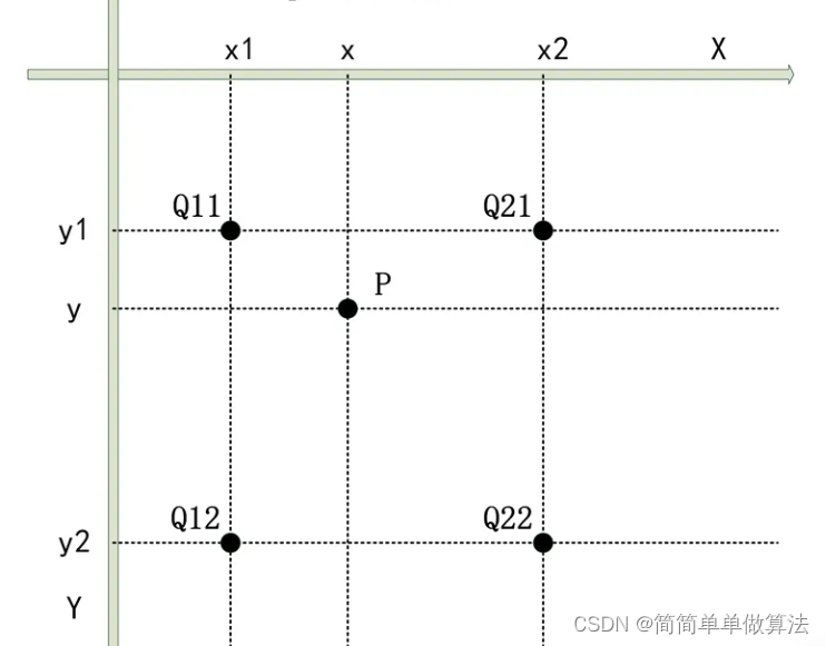 目标图像中的某点如果投影到原图像中的位置为点P,则此时取P最邻近点Q11,即 f ( P ) = f ( Q 11 ) f(P)=f(Q11) f(P)=f(Q11)。