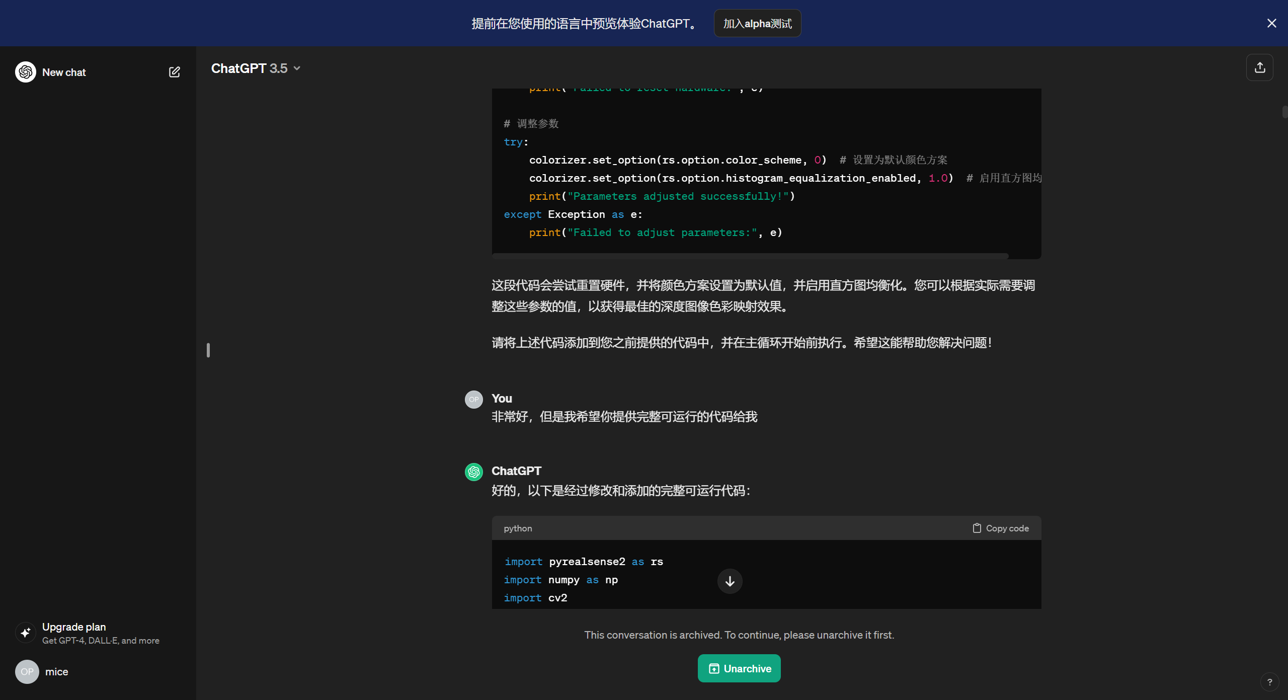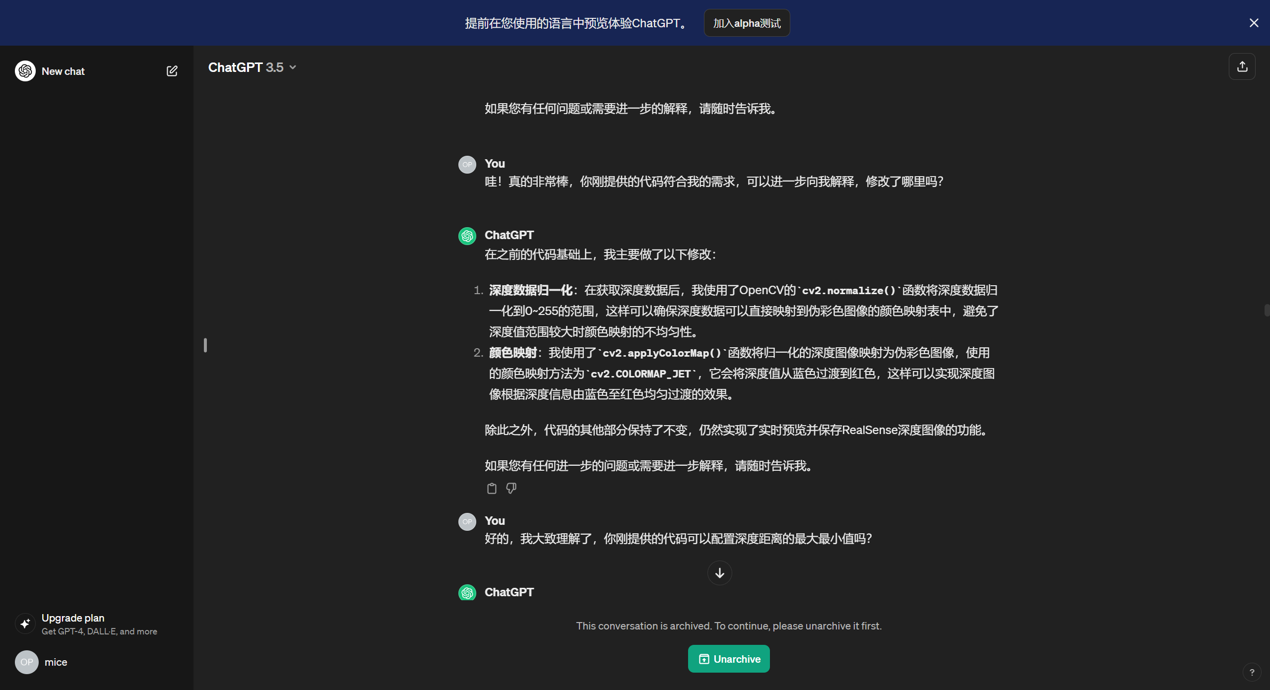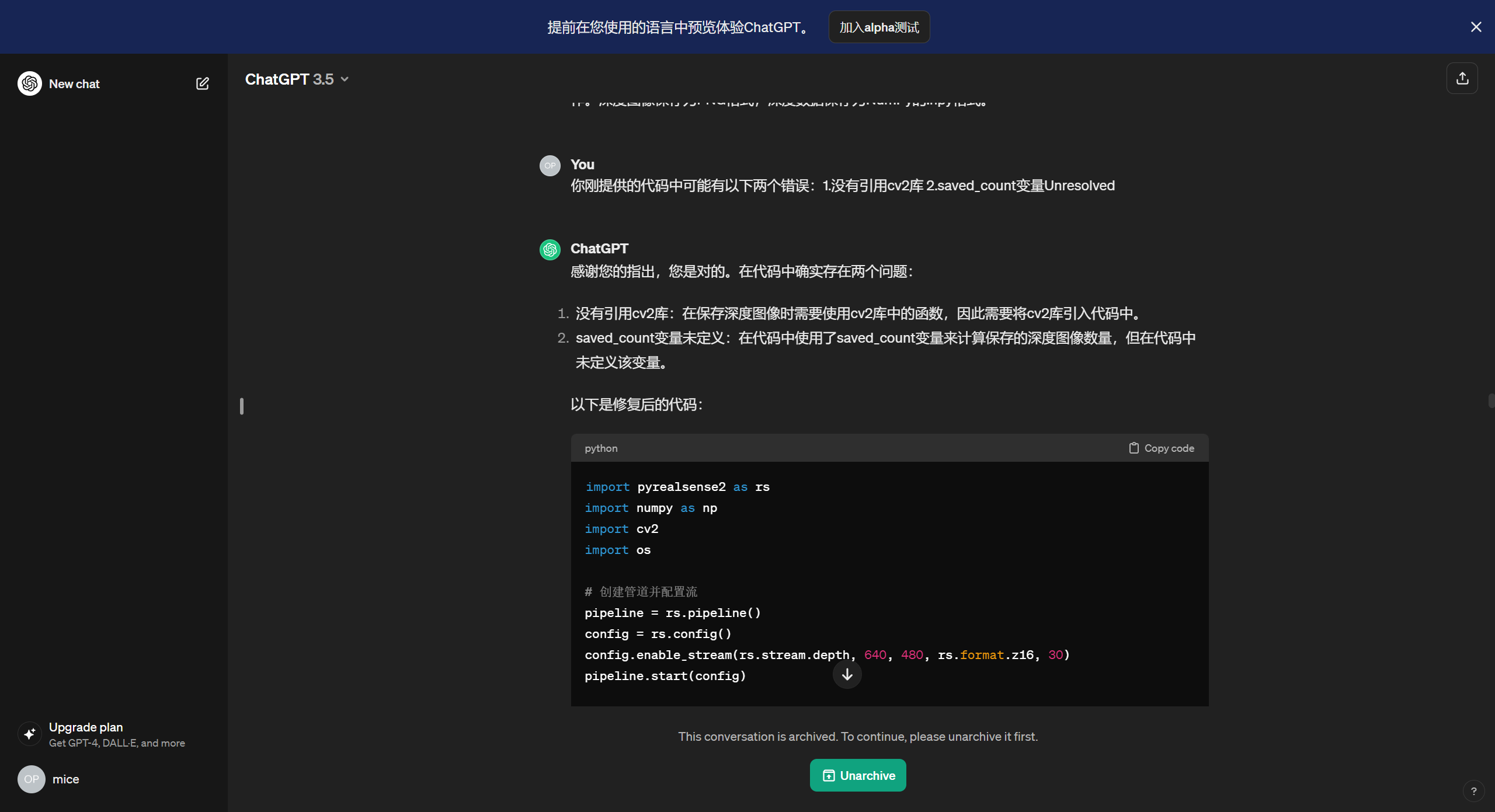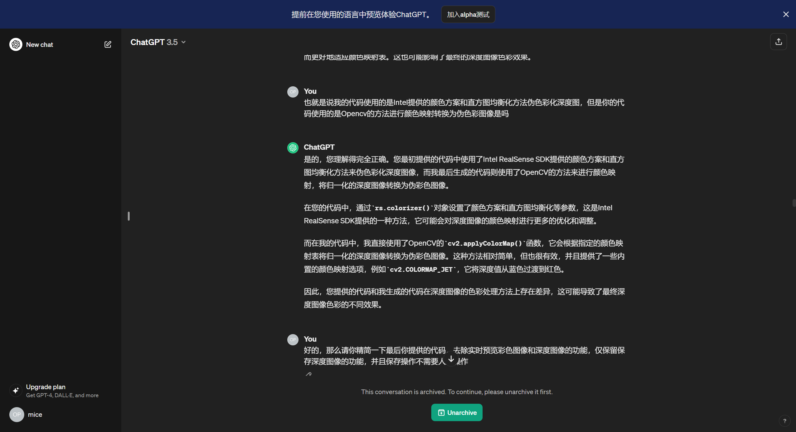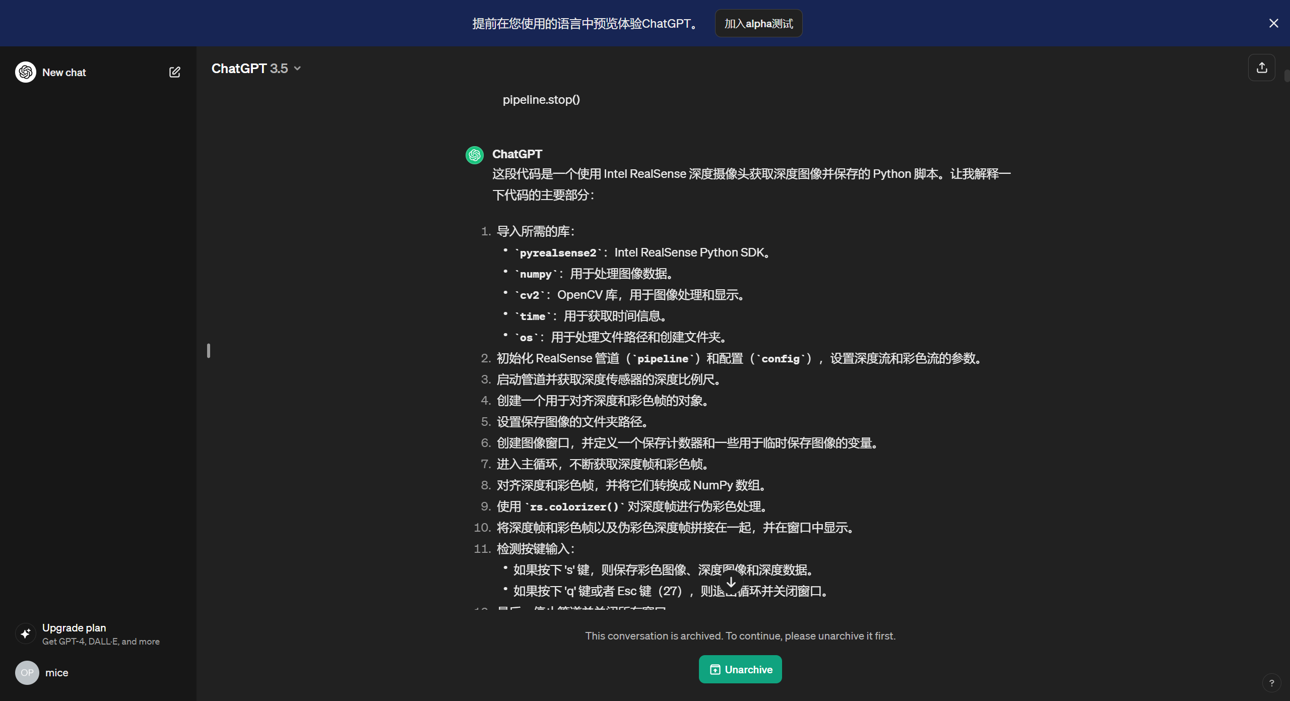 对话开始时,先给 ChatGPT 一个预设身份,例如我给它的预设身份就是一个精通 OpenCV 和 Intel RealSense 传感器的 Python 程序员