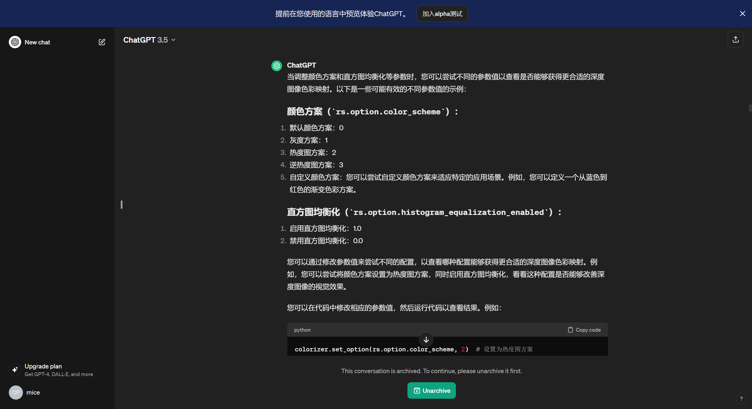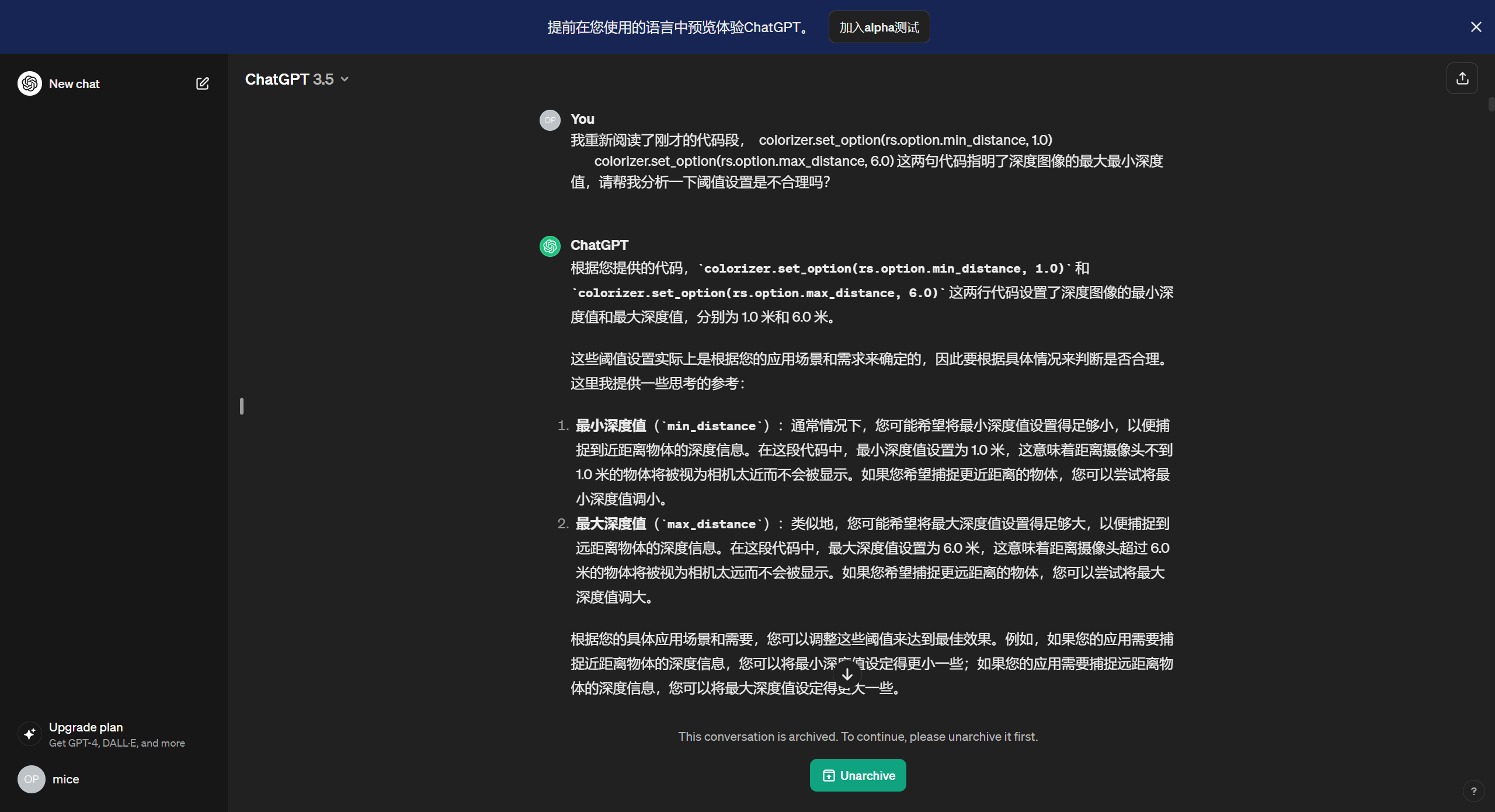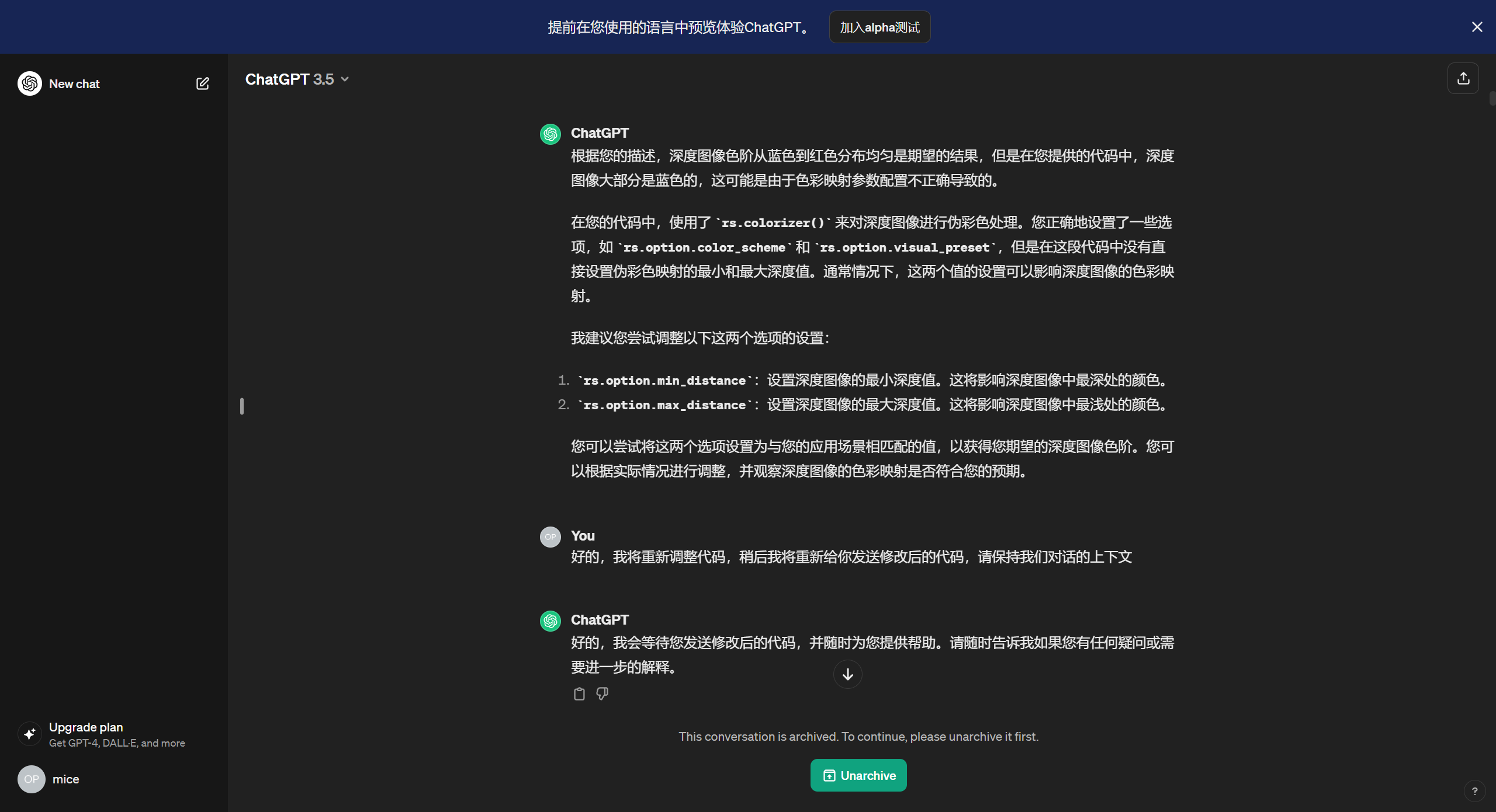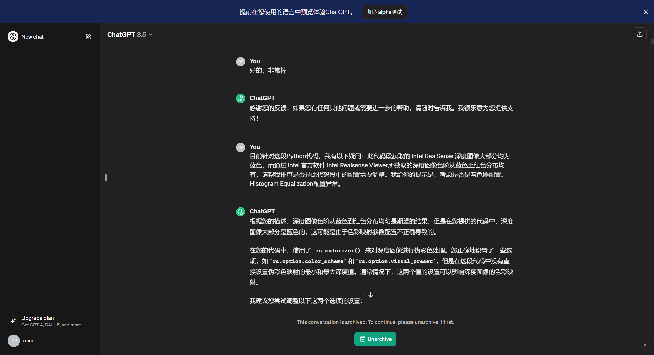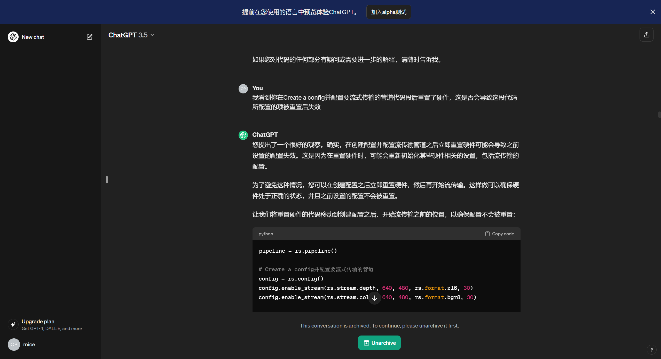 对话开始时,先给 ChatGPT 一个预设身份,例如我给它的预设身份就是一个精通 OpenCV 和 Intel RealSense 传感器的 Python 程序员