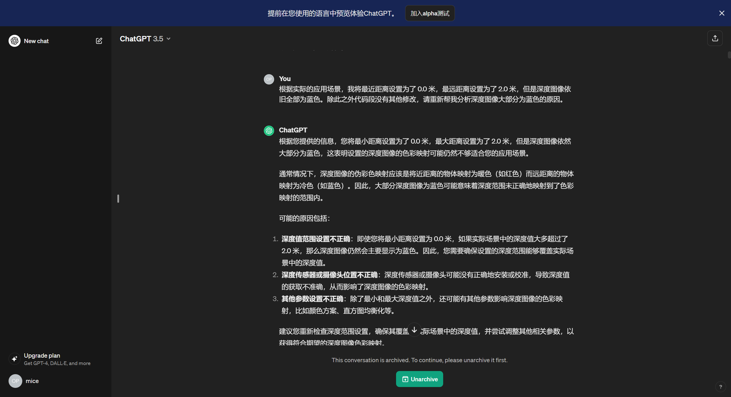 在确定 ChatGPT 对代码理解没有大的偏差以后,我就提出了我想解决的问题。简单补充一下问题背景,RealSense 是一款深度相机,可以获得拍摄物体的距离信息,在官方的软件上会以热力图的形式展示,而我所编写的代码所得到的深度图像是蓝色的,而不是像官方软件一样由红色到蓝色变化。我高强度 Google 搜索了接近两天,图中提到的着色器配置和直方图均衡化就是我所搜集到的线索信息,但是不论怎么调试都不起作用,于是想到了 ChatGPT。我就把这两点作为问题排查的方向提供给了 ChatGPT,这也是一个 AI 协作的小技巧吧,当你搜索到一些可能对解决问题有帮助的信息时,可以提供给 AI 这样可以大大缩短解决问题所需的时间。