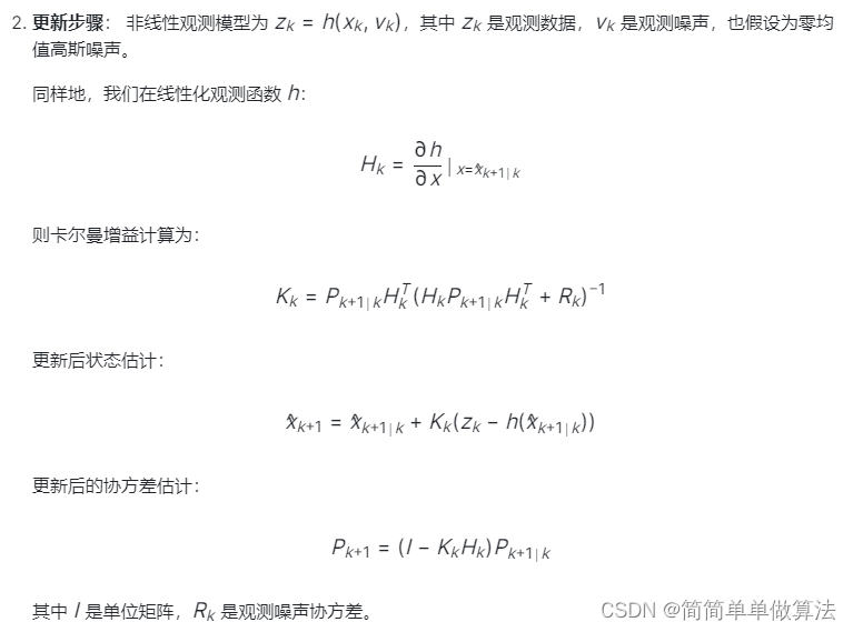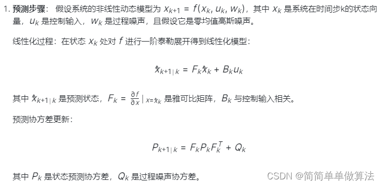 扩展卡尔曼滤波是一种处理非线性系统状态估计的方法,它通过线性化非线性过程和测量模型,在每次迭代中利用高斯分布的性质进行最优估计。